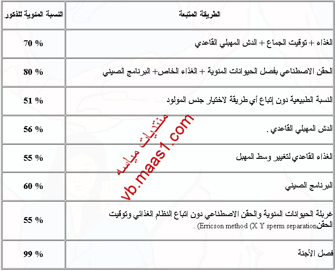 ونستعرض الآن جدولا يوضح نسب النجاح التي حققتها الطرق السابقة في تحديد جنس المولود مع الأخذ بعين الاعتبار بأنه لو تركت الأمور بالشكل الطبيعي تكون النسبة 51 % ذكورا و 49 % اناثا